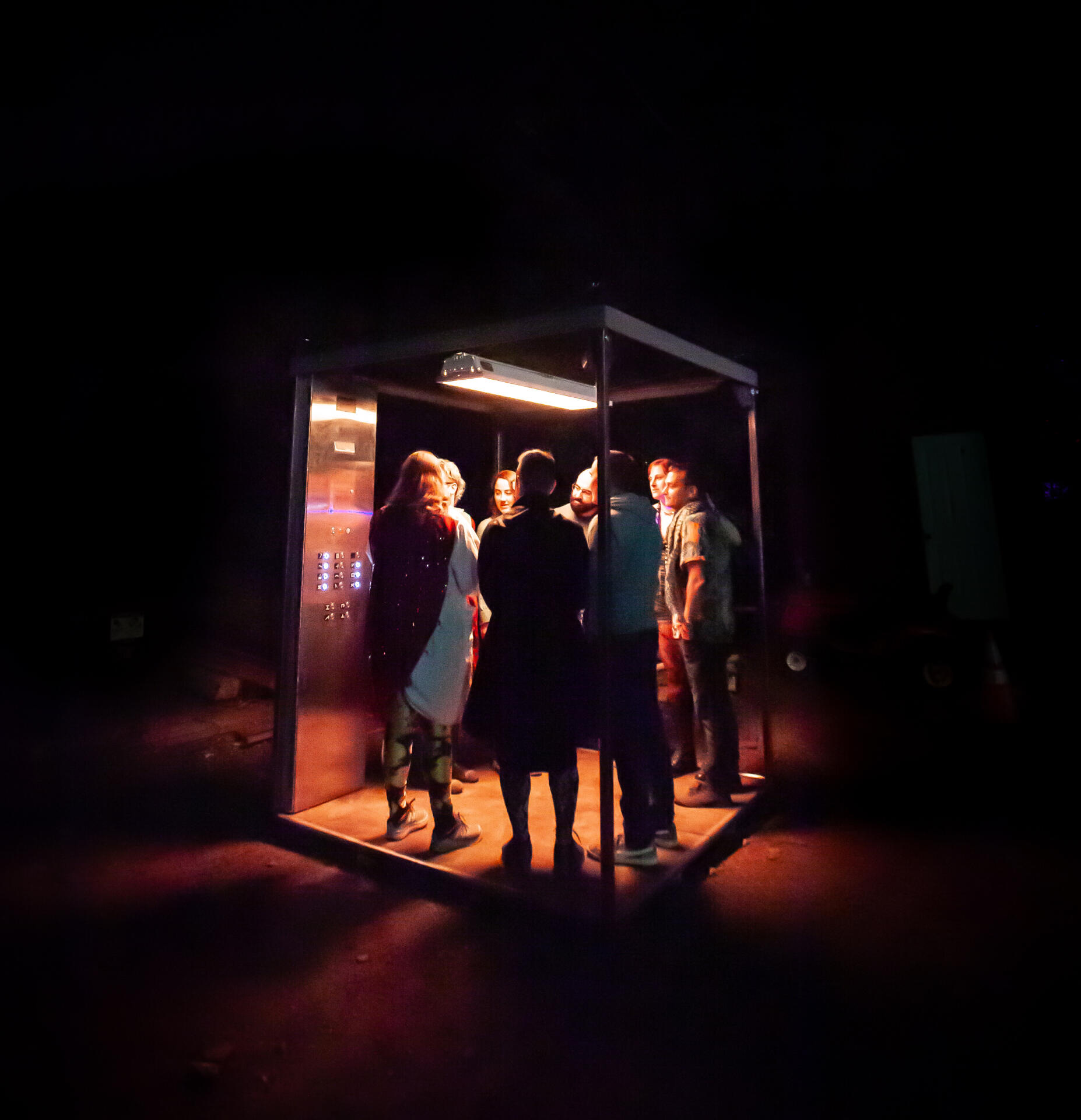 The Lift Away is an interactive art piece designed for people to explore as an individual or as a group. The structure is a platform which suspends a light and a full sized elevator panel. The 16 buttons on the elevator activate various sounds that play with the 4 channel speaker setup, giving people a sense of full immersion into the experience.