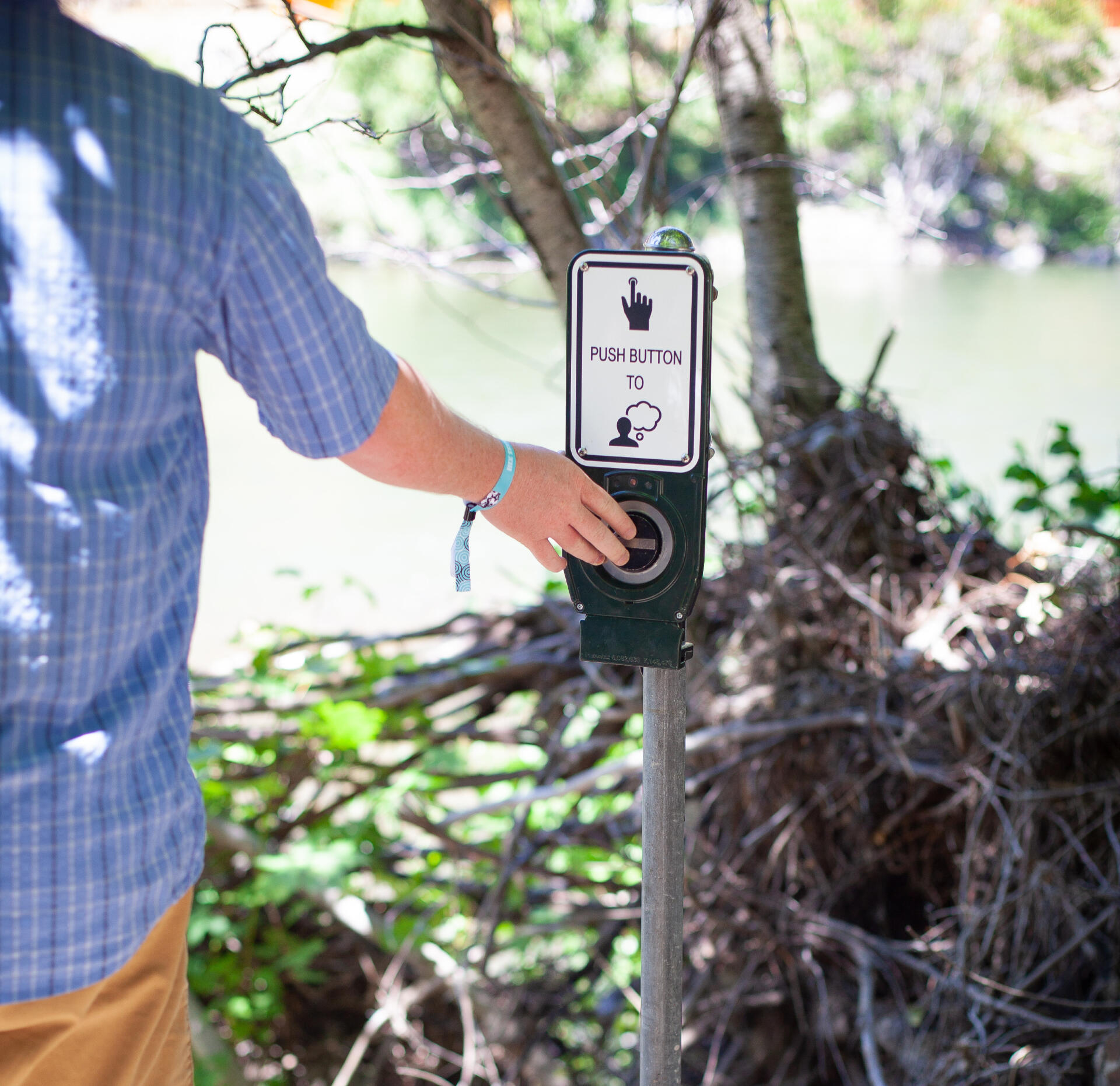 Wait asks what the role is of urban infrastructure in natural places. It takes the fundamental experience of pushing a wait button (which is a desire to be given permission in the city to continue on a path) and flips it so that people instead stop to appreciate the natural landscape they are in. Wait reminds people that the act of waiting can be as rewarding as the outcome one is waiting for.